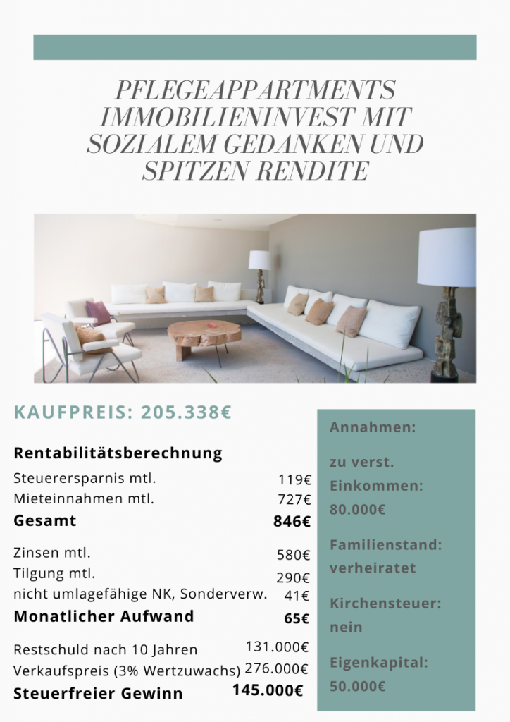 Mit der alternden Bevölkerung steigt der Bedarf an Pflegeimmobilien. Moderne Pflegeeinrichtungen bieten Ihnen langfristige Mietverträge und garantierte Mieteinnahmen. Eine stabile Anlage mit sicherer Rendite und minimalem Verwaltungsaufwand. Investieren Sie in eine Branche mit wachsendem Bedarf und genießen Sie die Vorteile eines konjunkturunabhängigen Investments.